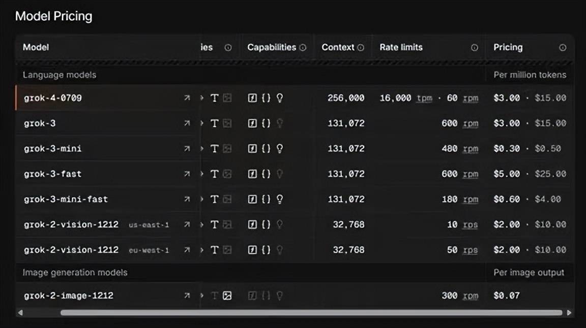 Grok 4 也同时开放了 API 的权限,目前仅支持文字+视觉的输入,纯文字的输出。定价是每百万 tokens 输入3美元,输出 15 美元。