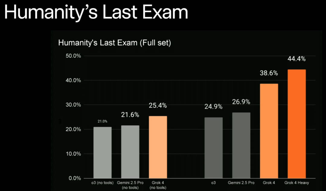 xAI 表示,在主流推理基准测试中,Grok 4 Heavy 全部拿下了 SOTA——HLE(人类的最后考试)甚至达到了 44.4% 的高分。