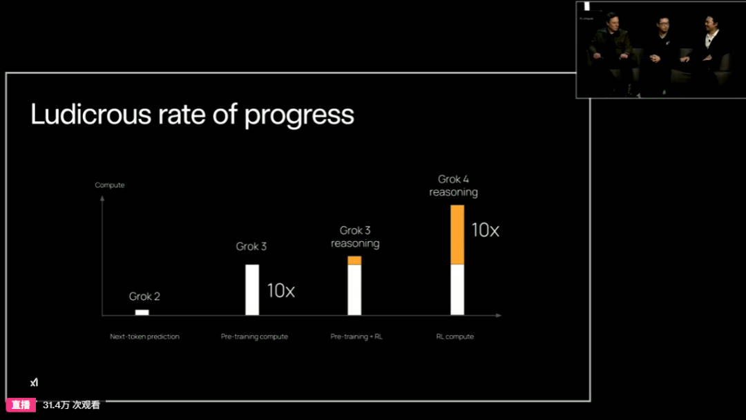 而 Grok 3 到 Grok 4 更侧重于推理训练,推理训练量提升了 10 倍。