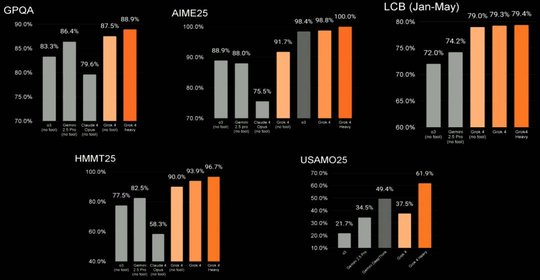 Grok 4 系列在 GPQA(研究生级问题)测试中得分 88-89,超过了 Gemini 2.5 Pro 成为新第一。而在 AIME25 数学竞赛题上,Grok 4 Heavy 更是取得了满分的成绩。