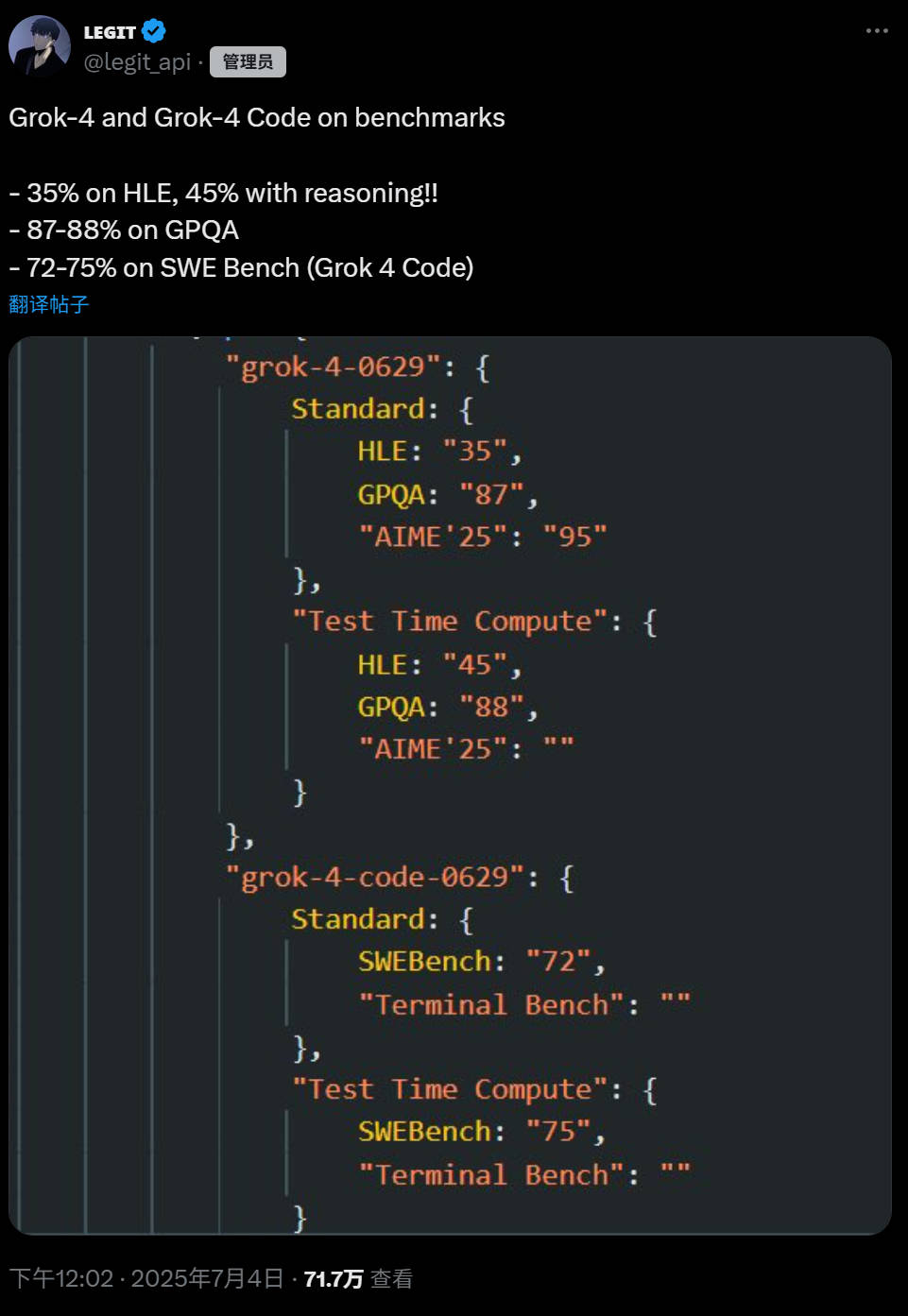 图 | 此前关于 Grok 4 的爆料(来源:X/@legit_api)