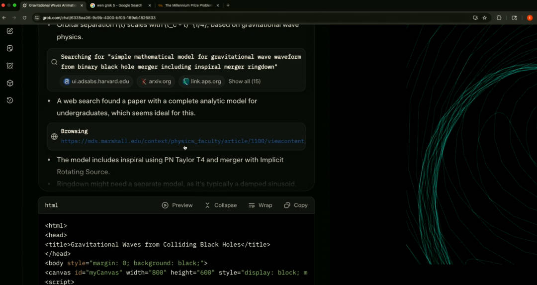 演示中,Grok 4 写了一段关于引力波和黑洞的模拟代码。在过程中,它调用了网络搜索、文献检索和阅读、代码运行等工具(功能)。最终实现了网页上可直接运行的模拟代码。