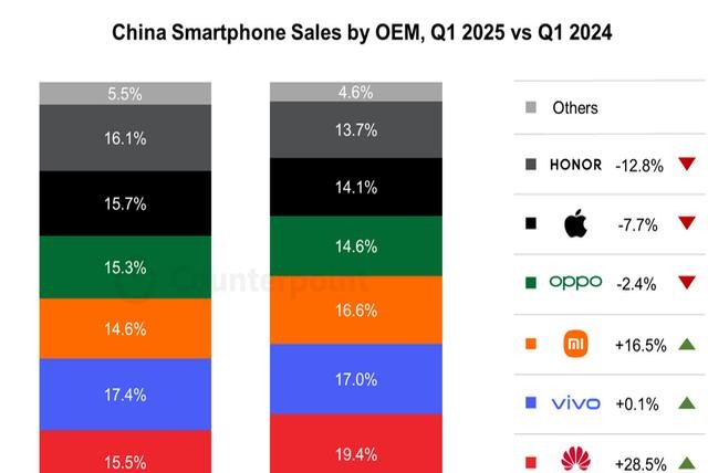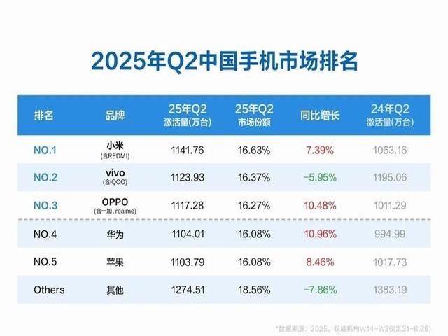 2025年上半年华为硬生生从苹果手里抢回中国市场第一的宝座,小米咬得死紧,苹果直接掉出前三。
