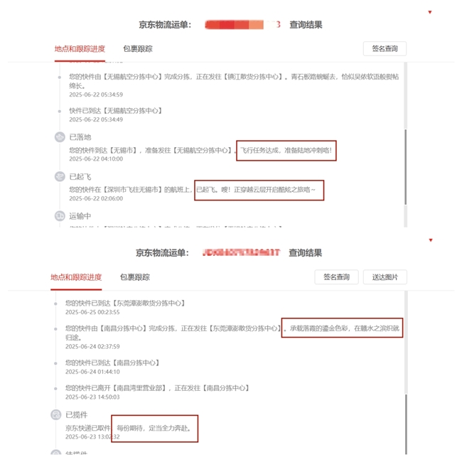相比于单纯呈现各物流节点信息的传统方式,京东物流升级后的物流轨迹更富有人文色彩。京东物流快递产品相关业务负责人表示,物流轨迹是查件的高频场景,也是用户体验核心触点。此次升级后,用户获取的物流信息,将结合节庆关怀、山川湖海、历史文化等多个因素进行大模型润色加工,进而让服务更加透明、高效、有温度。