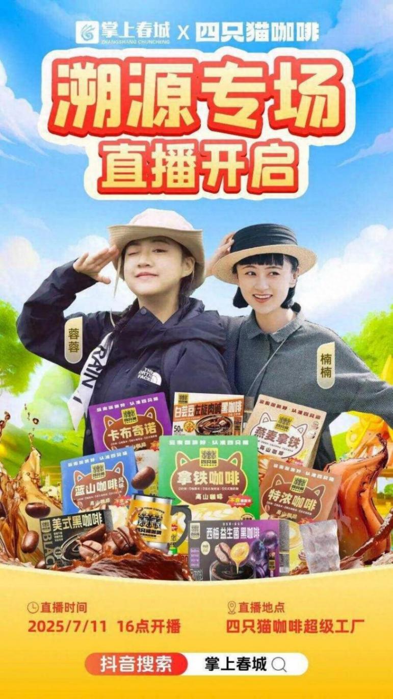 7月11日下午4点,掌上春城携手四只猫咖啡,将在抖音直播间开启一场咖啡盛宴的直播专场!