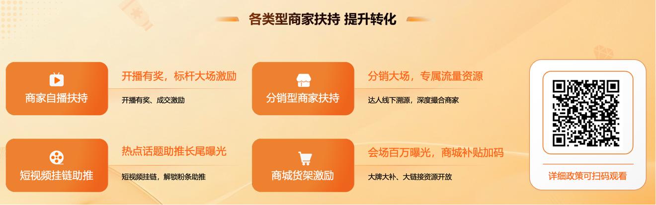 针对分销型商家,分销大场将获得平台专属流量资源扶持,并结合达人线下溯源活动,深度撮合商家。对于货架型商家,快手平台将提供百万曝光的流量会场资源,以及专属坑位和开屏导流支持,此外,在商城大牌大补频道中也会有曝光资源的支持。