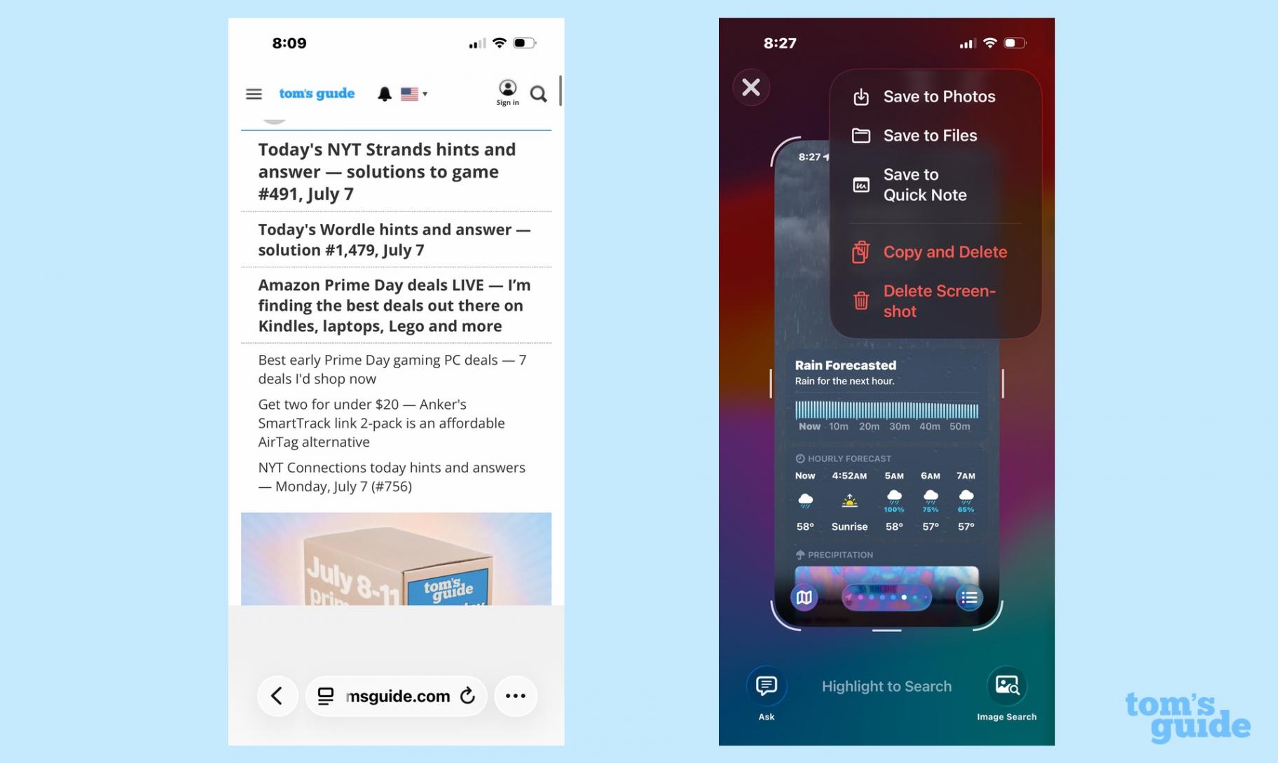 iOS 26 中的 Safari(左)和 Visual Intelligence 屏幕截图(右)(图片来源:Future)