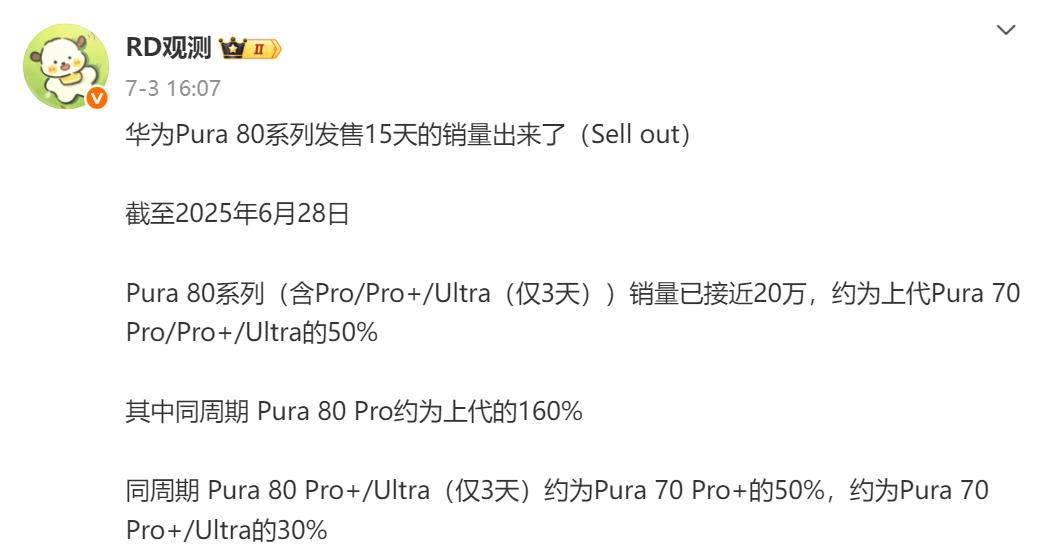 博主RD观测分析,华为Pura80系列首销15天,据不如上一代。华为Pura80 Pro/Pro+/Ultra首销三天接近20万台,约合上一代三款手机50%左右。华为Pura80 Pro销量达到上一代160%,主要原因是上一代Pro版严重缺货。Pro+约合上一代50%、Ultra约合上一代30%,销量明显下降。