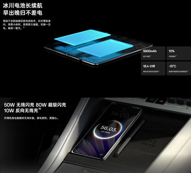 5600mAh冰川电池采用硅碳负极技术,轻松满足一天的使用需求,配合80W超级闪充与50W无线闪充,随时随地快速回血,彻底解决折叠屏续航焦虑。