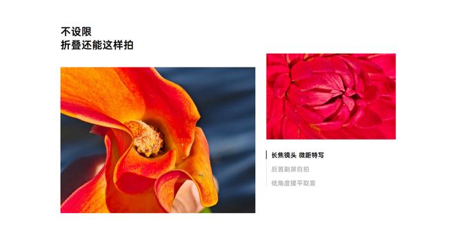 后置50MP主摄+8MP超广角+50MP潜望长焦的哈苏三摄系统,支持3倍光学变焦与120倍数码变焦,独创的折叠屏人像引擎可智能识别内外屏场景,优化焦段与色彩表现。悬停摄影模式下,折叠至任意角度即可实现稳定长曝光,满足专业级创作需求;更有玩法独特的长焦微距,带你解锁长焦摄影的独特可能性。