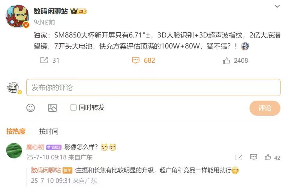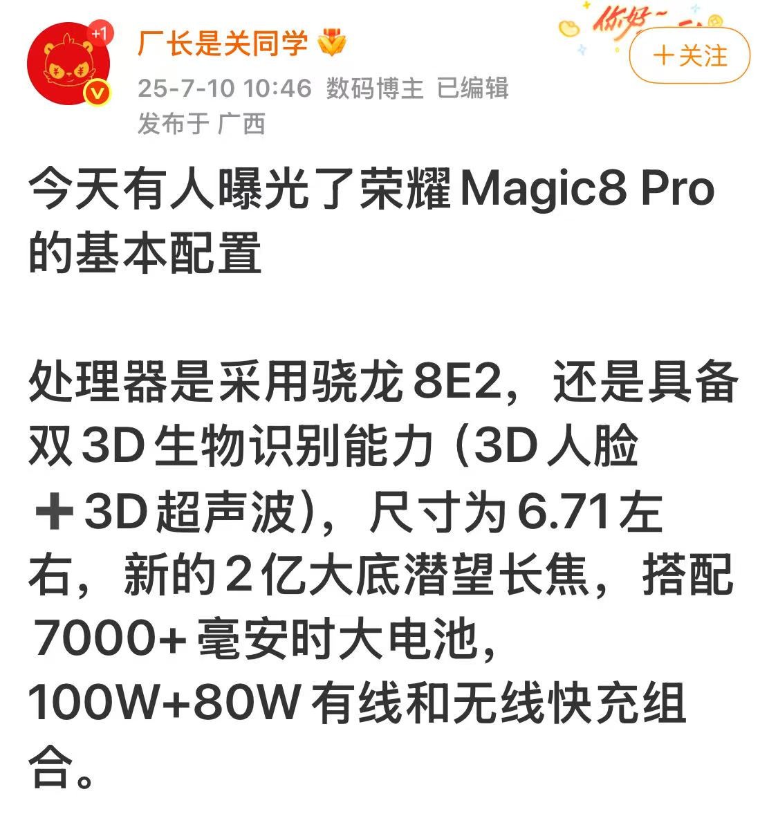 根据数码博主数码闲聊站透露,荣耀Magic8 Pro搭载SM8850,也就是骁龙8Elite2处理器,俗称第二代骁龙8至尊版,采用第三代台积电3nm工艺制程,据说Geekbench6单核跑分超过4000,多核跑分超过11000,性能非常牛,当然这并非荣耀独显,其它品牌也会发布,可能由小米16首发。此外,提供LPDDR5X和UFS4.1内存+闪存组合,最高提供16GB+1TB容量版本。