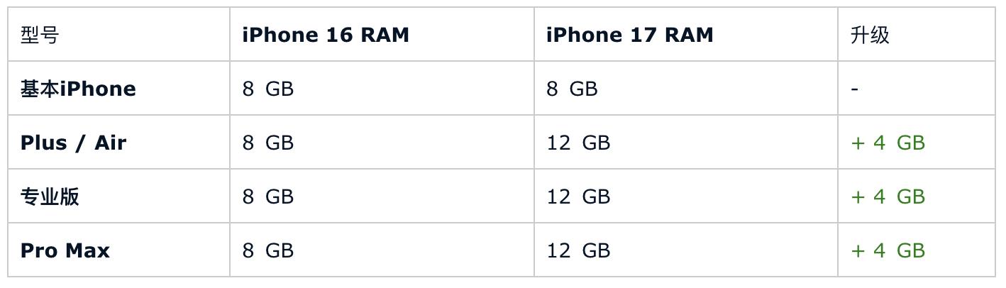 接下来,我们将iPhone 16系列的RAM配置与iPhone 17系列进行对比: