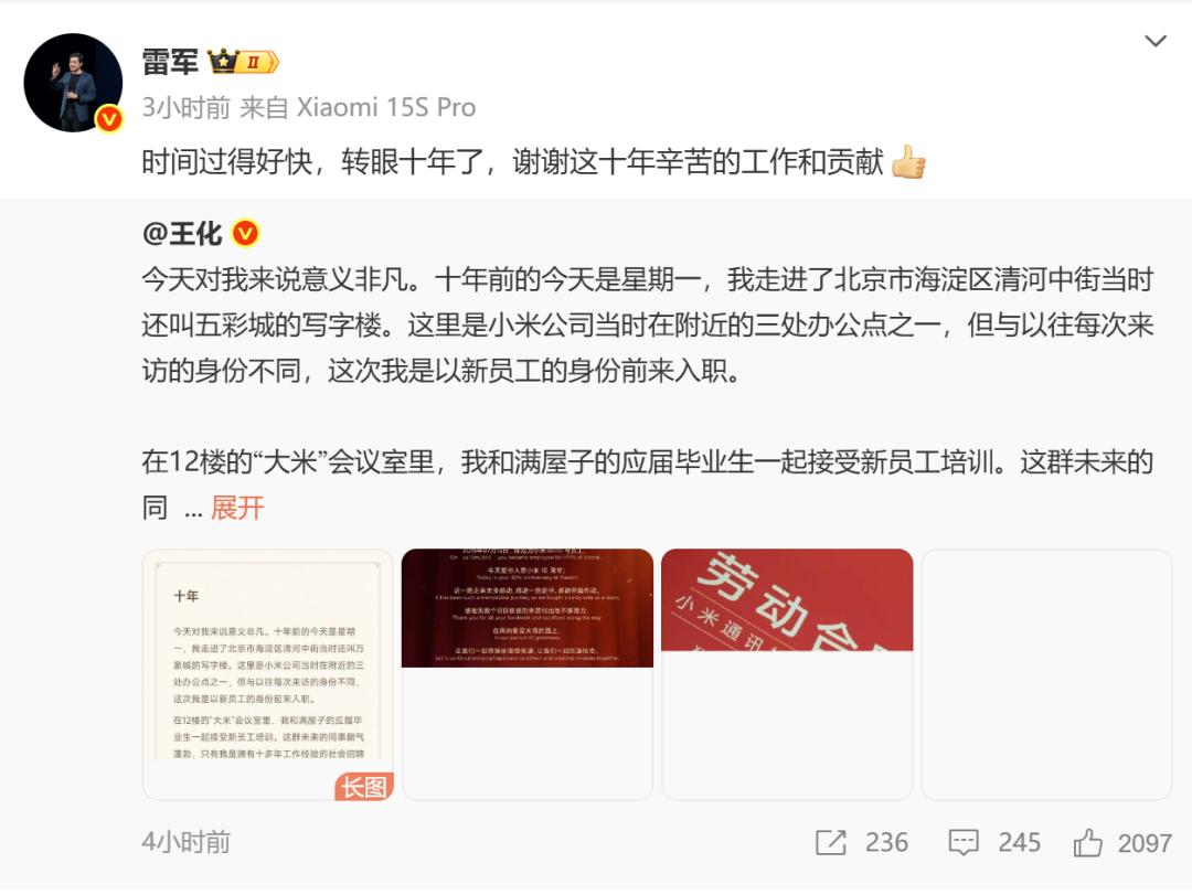 7月13日,王化发文感叹自己在小米度过了十年,雷军转发并感谢其十年辛苦工作和贡献。