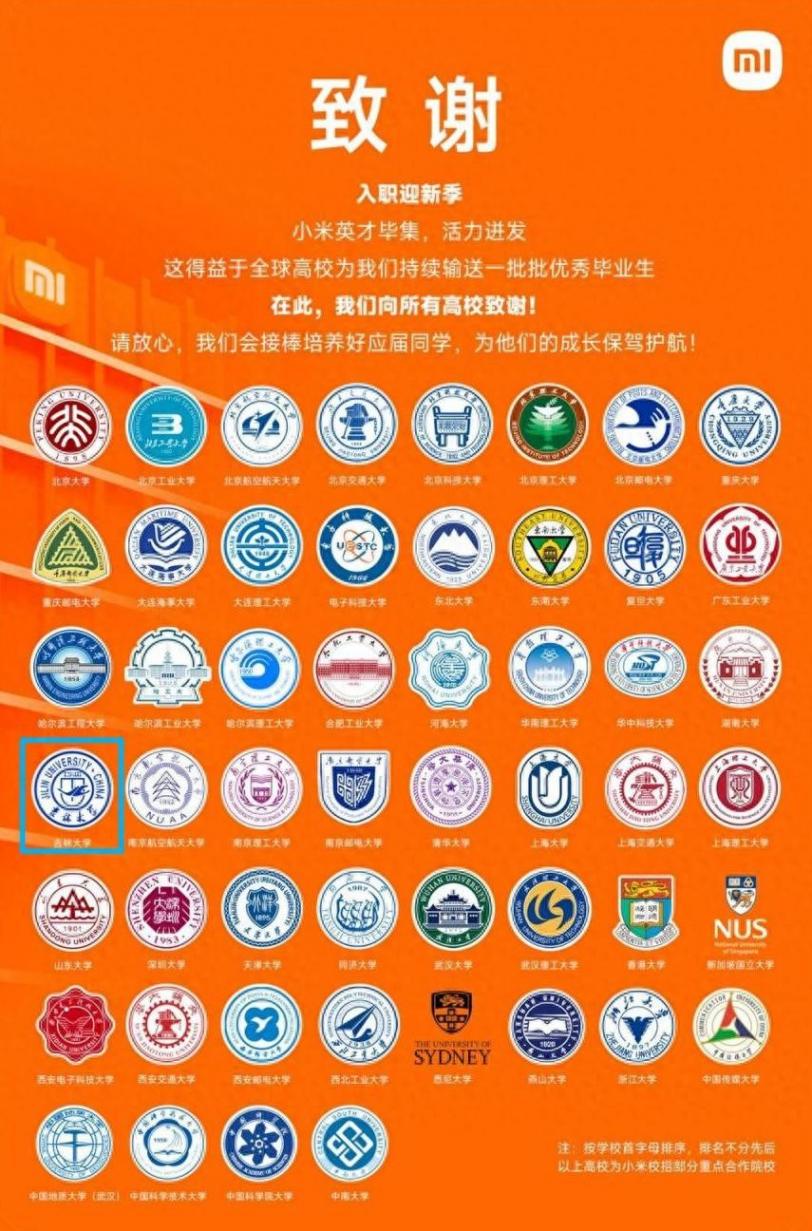 小米公司去年干了一件事。它公开感谢了52所大学,说谢谢你们给我们送了这么多好学生。吉林大学也在感谢名单上。