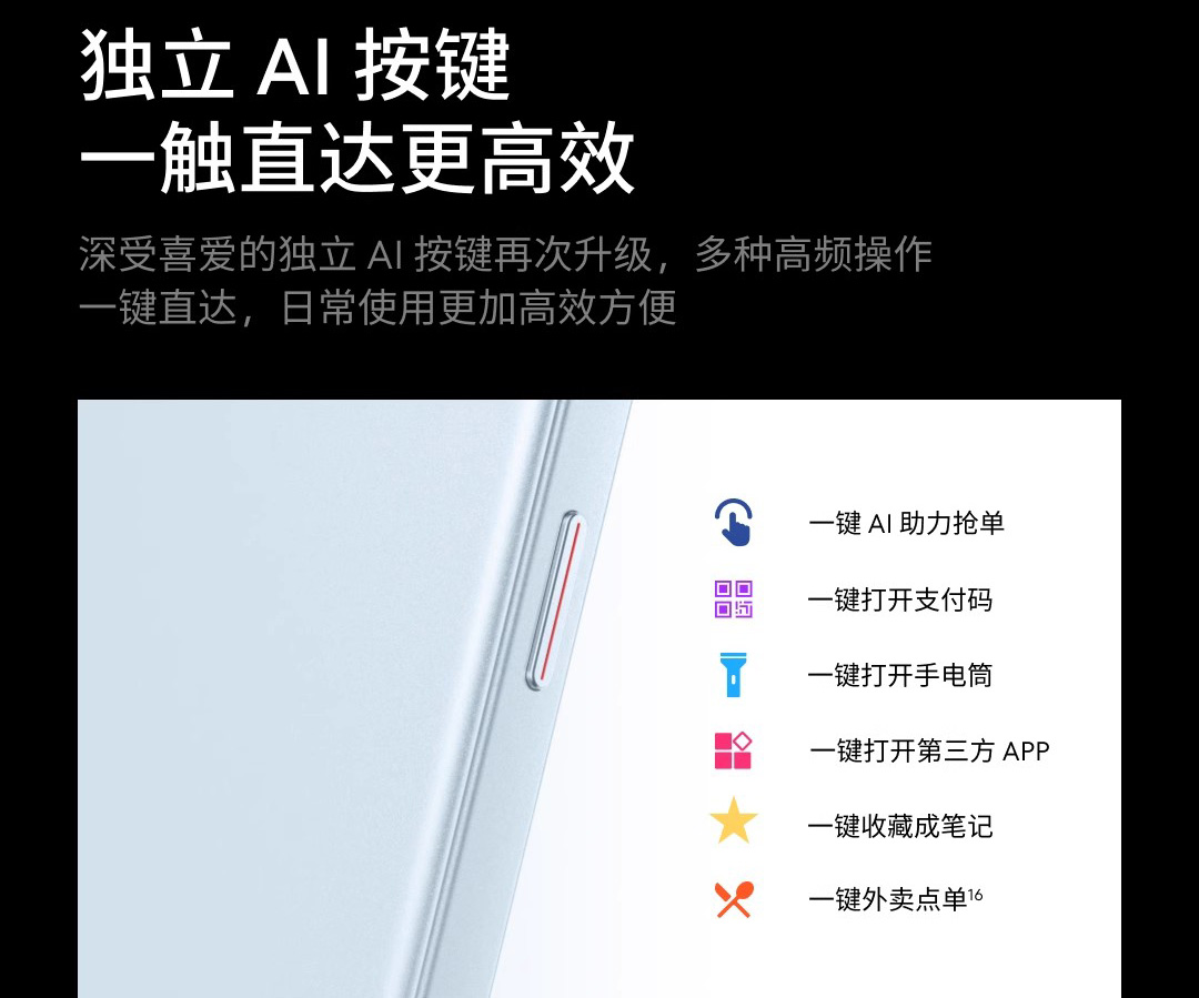 对于外卖骑手而言,抢单是非常重要的一步,如何快人一步抢到理想的订单,也是提高送餐效率的关键。该机的侧边有一个独立AI按键具有一键触达抢单页面的功能。比如你现在在看抖音,只要按下这个AI按钮就可以跳转到第三方软件的抢单页面,进行快捷抢单。这个功能也是外卖员最喜欢的功能。