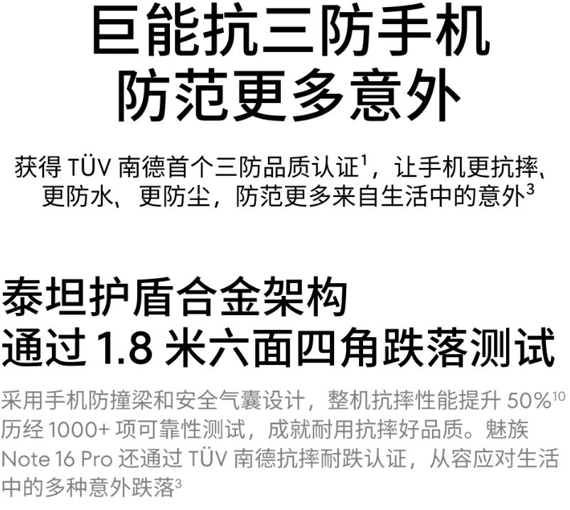 由于外卖骑手的工作环境比较复杂,所以三防功能就必不可少了,手机更耐摔,防水,防尘。减少手机发生故障的概率,延长手机使用寿命。针对下雨天,魅族Note16Pro还支持湿手操作和手套模式。让操作更得心应手。