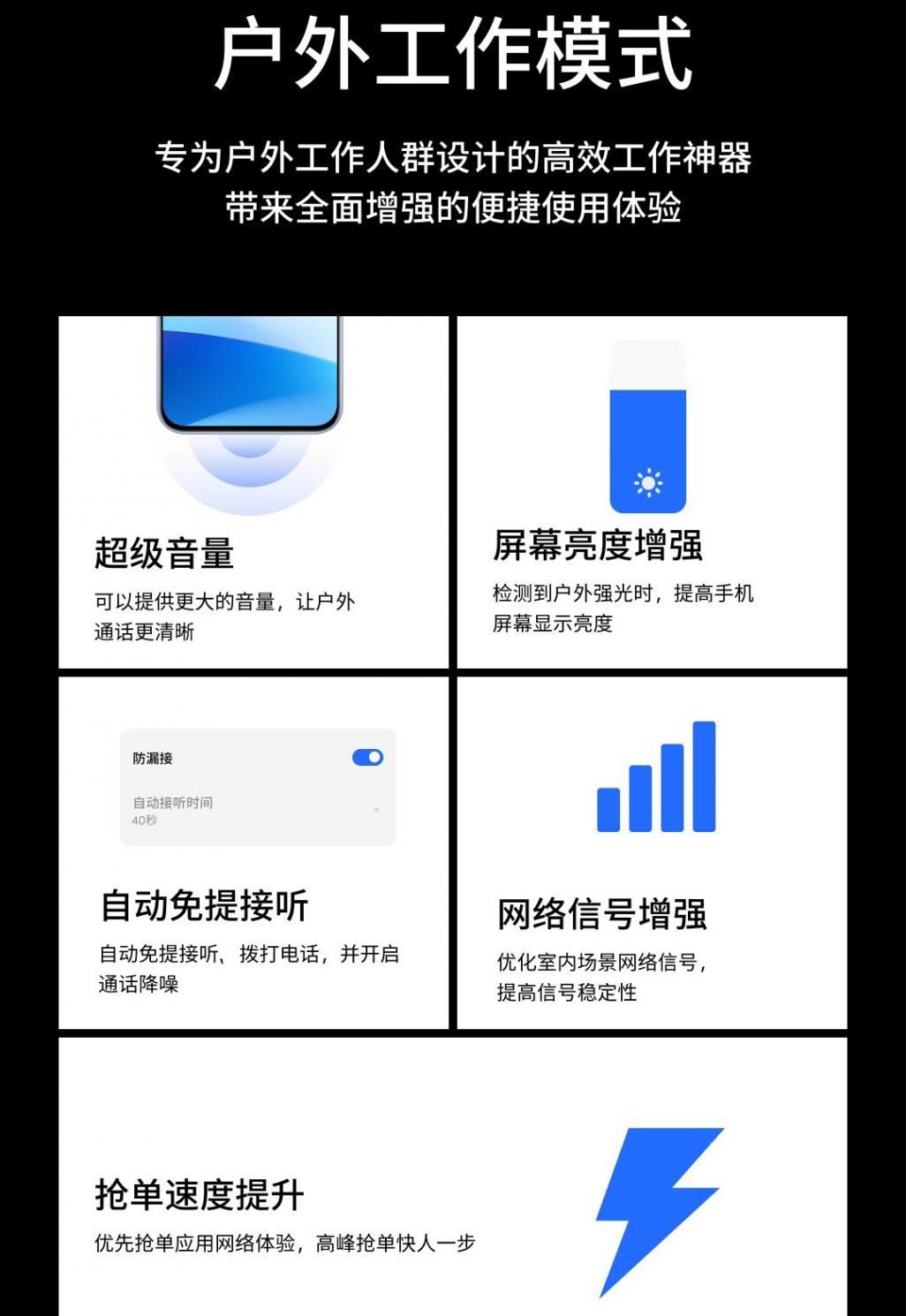 外卖骑手主要是在户外工作,只要开启户外功能,就可以提高手机音量,提高屏幕亮度,信号自动增强,这些都是户外工作非常实用的功能。让外卖工作更加顺畅。