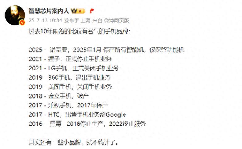 这不在7月13日行业人士“智慧芯片案内”就统计出过去十年消失的手机品牌汇总,且他统计的都是比较有名气的手机品牌,还不算那些不知名的小品牌呢。根据他统计的信息2016年黑莓手机停止生产,2022年终止服务。其实国内用户对于黑莓这个品牌了解不是很多,他最出名的就是全键盘以及安全的邮件模式等等,当时奥巴马最喜欢这个手机品牌。2017年HTC把手机业务卖给了谷歌,此后HTC手机……火腿肠是网友对他最亲切的称呼,且HTC还是安卓第一人。当年比苹果、三星响亮多了,最后也不知道怎么回事就……