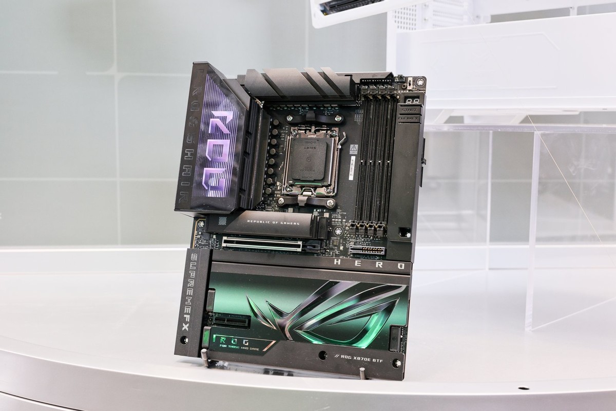 ROG玩+乐园现场展出首款AMD平台ROG背置主板——ROG CROSSHAIR X870E HERO BTF。有背置接口设计和背置显卡供电插槽,提供600W+电能,减少正面线材,美观易理线,小白装机轻松上手。近乎全覆盖的金属装甲,加上Polymo动态灯效2.0,让颜值再提升。采用18(110A)+2(110A)+2供电模组,搭配混合双模超频,轻松驾驭AMD锐龙9000系处理器。再度给大家扩充BTF背置系列产品阵容,满足大家所需。