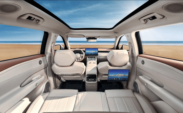 座椅方面,岚图FREE+车内座椅采用皮质材料包覆,副驾全系标配“女王座椅”,配备4向电动腿托调节,并提供大角度躺倒设计,最大角度可达163度,支持通风、加热、按摩功能。后排座椅同样支持通风、加热,并且提供后排吸风功能,靠背还具有12度电动调节。副驾座椅后方的HSpace-Link拓展坞支持多种平板电脑,连接后屏幕可独立使用,也可与中控屏进行交互,为后排乘客提供了丰富的娱乐体验。