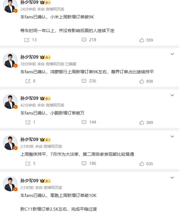 孙少军表示:“上周整体持平,7月作为大淡季,第二周各家表现都比较普通,小米汽车等车时间一年以上,并没有影响后面的人继续下定。”