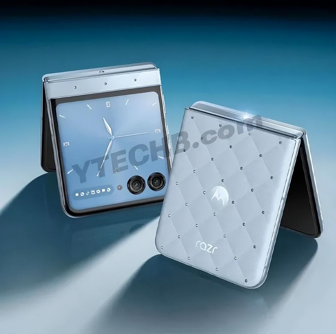 该爆料源于YTECHB上周五(7月11日)发布的一张渲染图,图中展示了一款外观华丽、镶嵌水晶的摩托罗拉Razr手机。