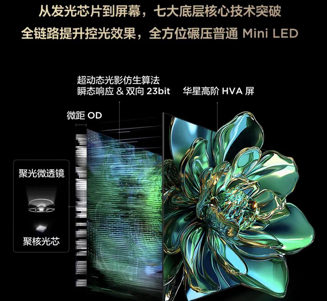 - Mini LED系统级优化:通过背光均匀度提升60%、光晕面积减少45%,242分区实现普通500分区的控光效果;