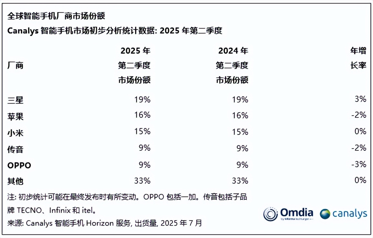 7月15日知名数据调研公司Canalys正式发布了,2025年第二季度全球智能手机报告。