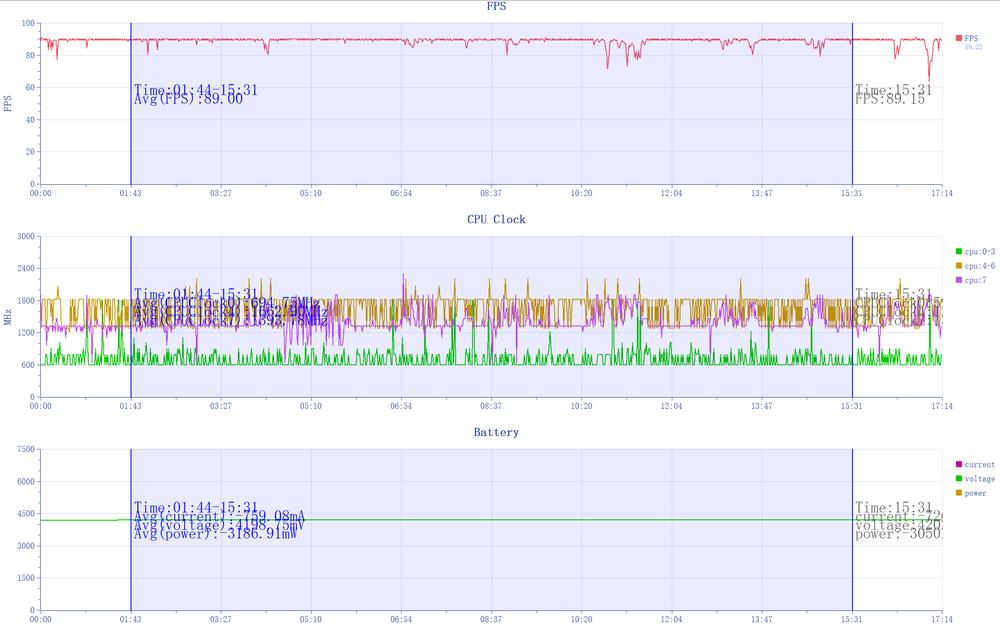首先在日常游戏中,王者荣耀开启90帧模式的高画质,平均帧率88.92fps,最低帧63.53fps,抖动率1.19,最大温度39℃。整体还算比较流畅,能玩的程度。