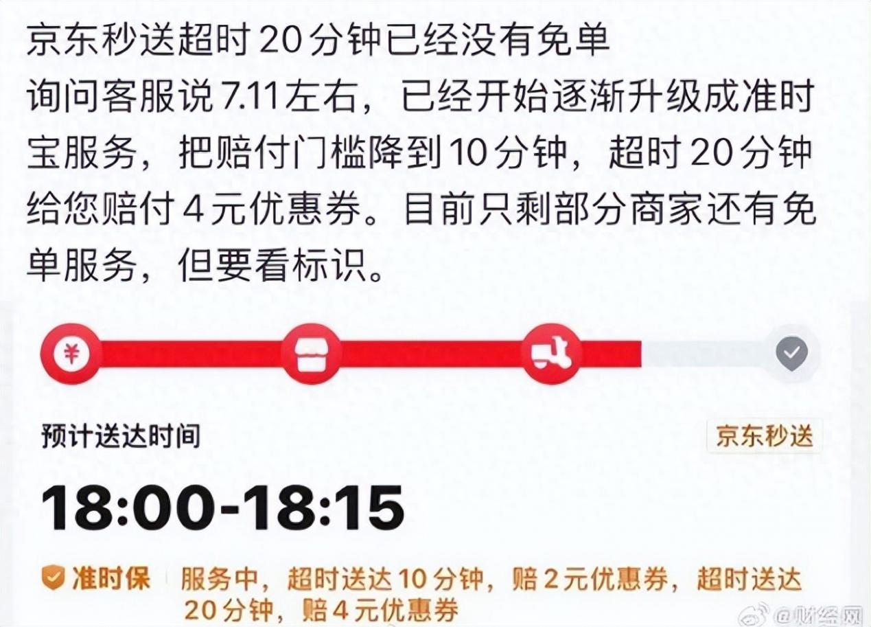 7月16日,据财经网,社交媒体上,不少用户发文称,京东外卖取消了曾被视为护城河的“超时20分钟免单”服务,改为了“超时20分钟赔付4元优惠券”。