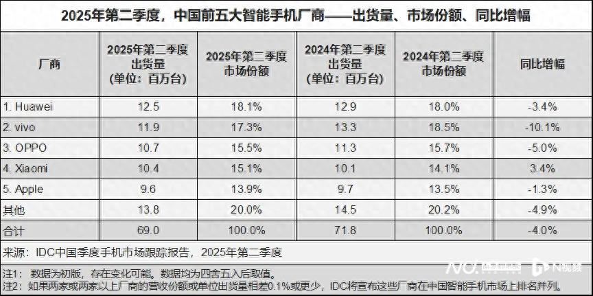 在中国市场,IDC数据显示,2025年第二季度中国智能手机市场出货量结束了连续六个季度同比增长,出货量只有6896万部,同比下降4.0%。值得注意的是,华为今年第二季度在中国智能手机市场的份额达到约18%,重回榜首,而vivo和OPPO等品牌的市场份额下滑。