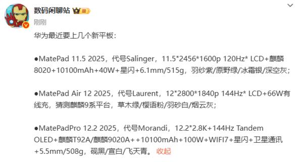 此外,华为MatePad Air 12 2025代号为“Laurent”。它采用12英寸LCD屏幕,支持2800×1840分辨率和144Hz刷新率。该博主猜测将搭载麒麟9系平台。另外,该平板支持66W有线快充,拥有草木绿、樱语粉、羽砂白和烟云灰四种配色。