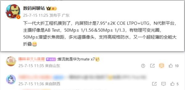 7月15号网上有数码博主说华为要出新款折叠手机Mate X7,主打拍照功能升级,主摄像头能自己变光圈大小,还有多光谱镜头,屏幕防水也做了加强。这消息是CNMO科技报道的,具体参数开始陆续被挖出来了。