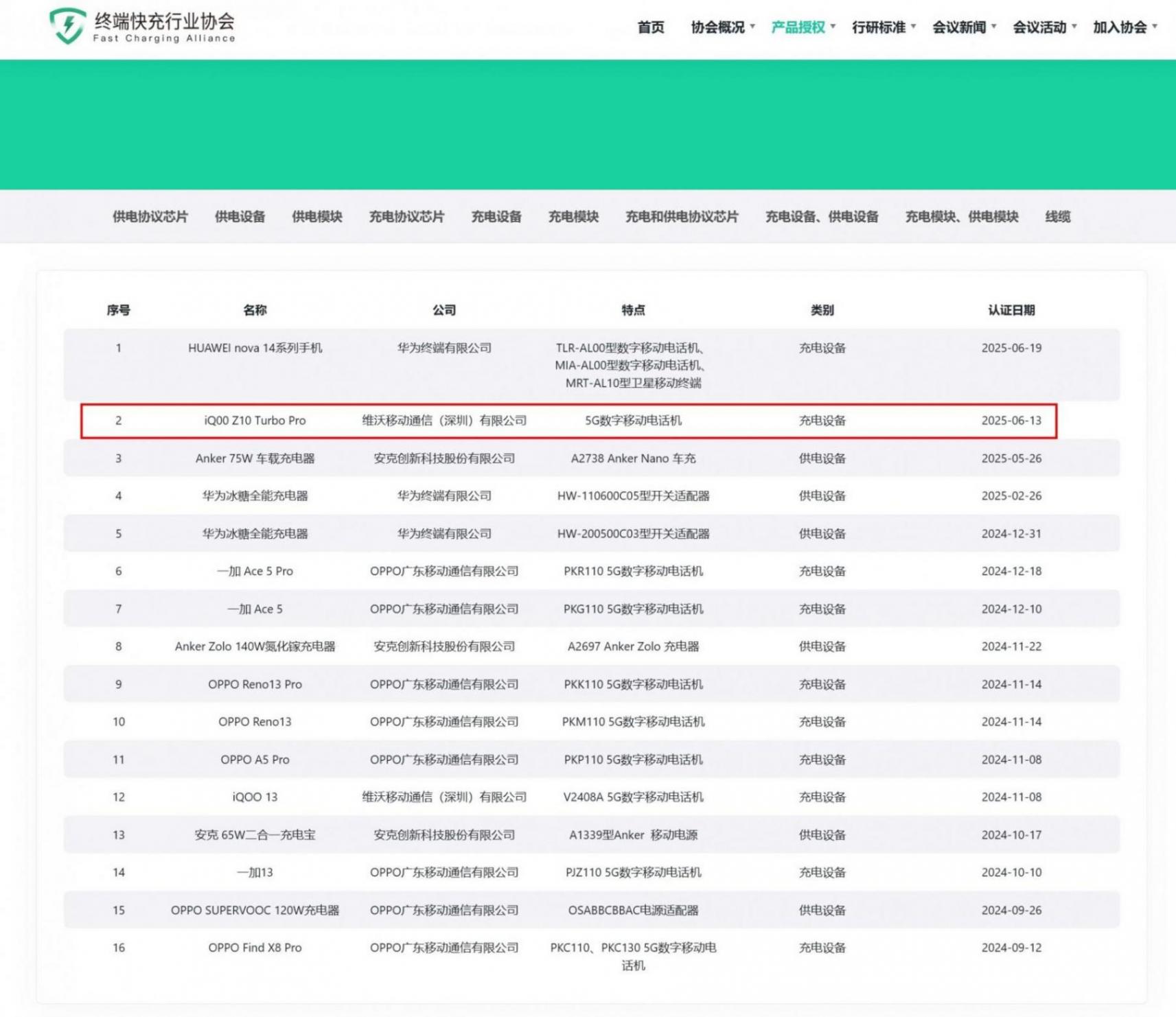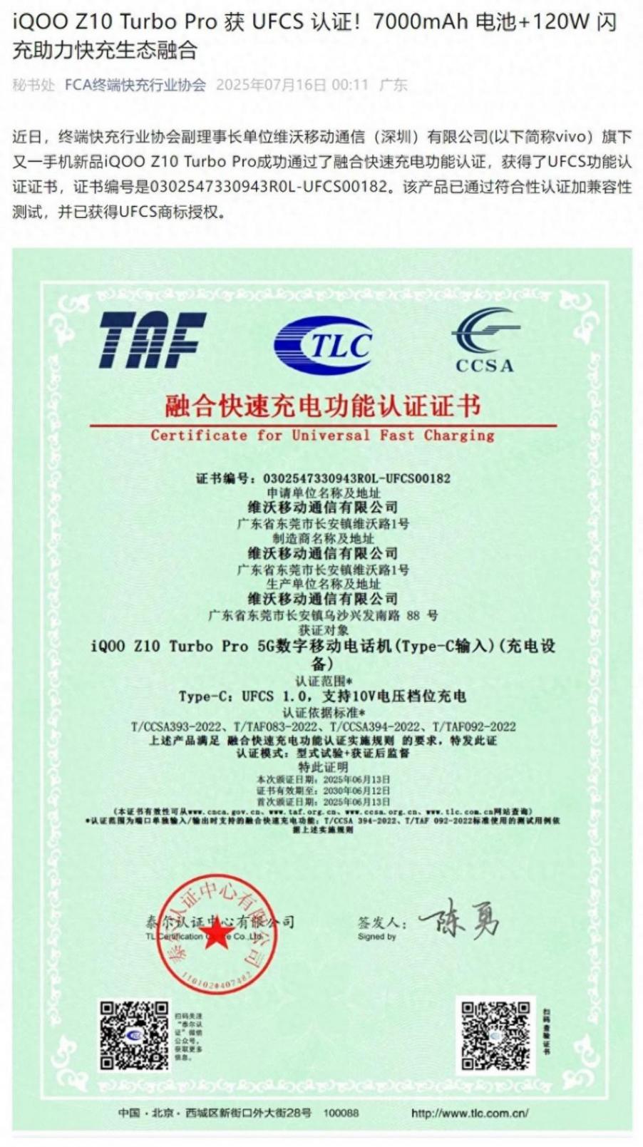7月16日消息,据FCA(广东省终端快充行业协会)消息,vivo旗下iQOOZ10 Turbo Pro手机已通过 UFCS(Universal Fast Charging Standard)融合快充认证,证书编号为