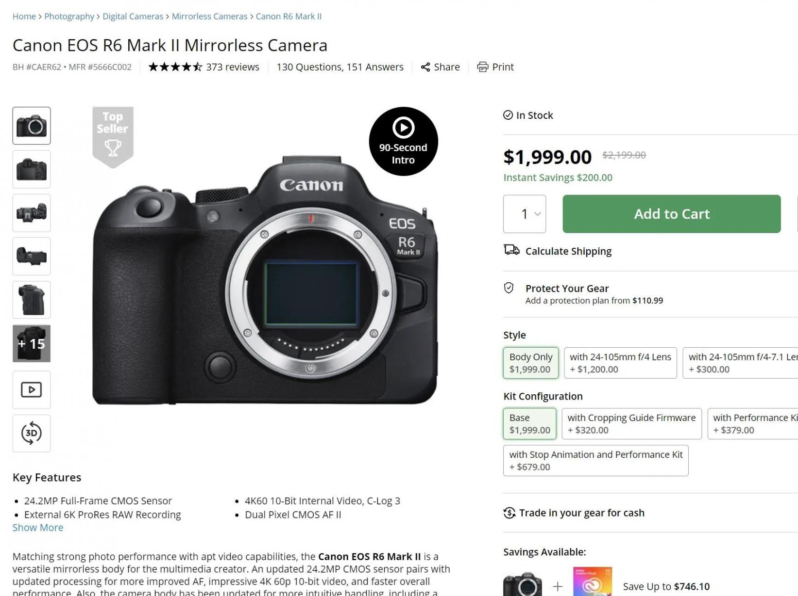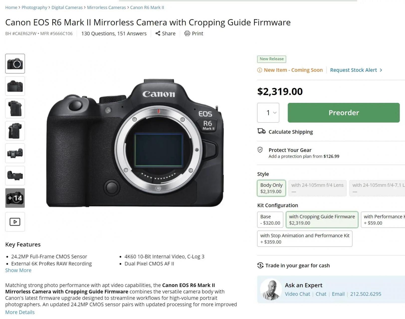 比如EOS R6 II标准版海外售价为1999美刀,内置构图(裁切)参考线固件的特别版则是2319美刀!