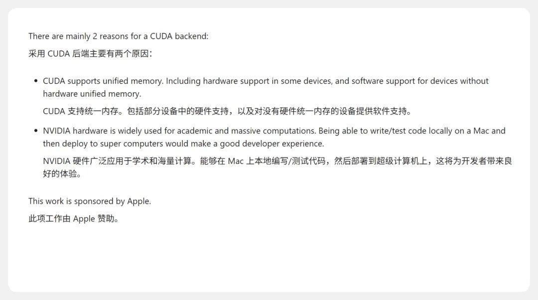也正是由于CUDA生态太强了,苹果这次也不得不主动放下姿态——