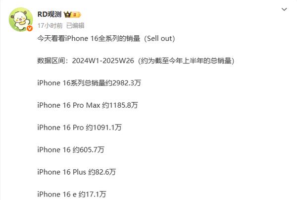 近日,有数码博主曝光了iPhone 16系列截止2025年第26周在中国大陆市场的最新销量数据: