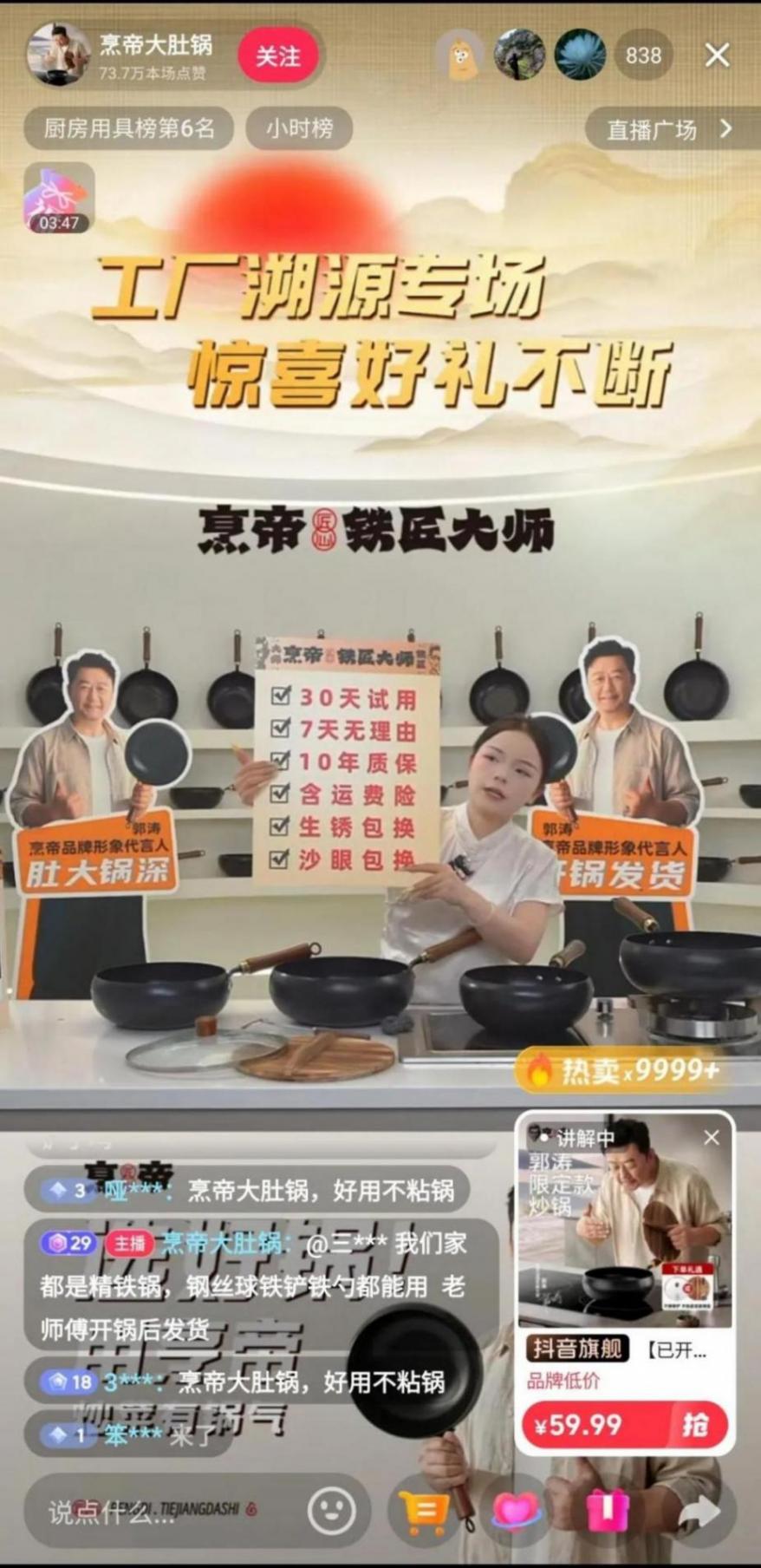 据了解,“烹帝”去年才正式转型做锅具。但就是这么短的时间里,烹帝却表现出了惊人的发展速度。其先是聚焦直播场景,打造出了一款爆品“大肚锅”,而后在今年4月请来明星代言,今年“618”期间,烹帝的明星专场直播实现GMV超850万元。