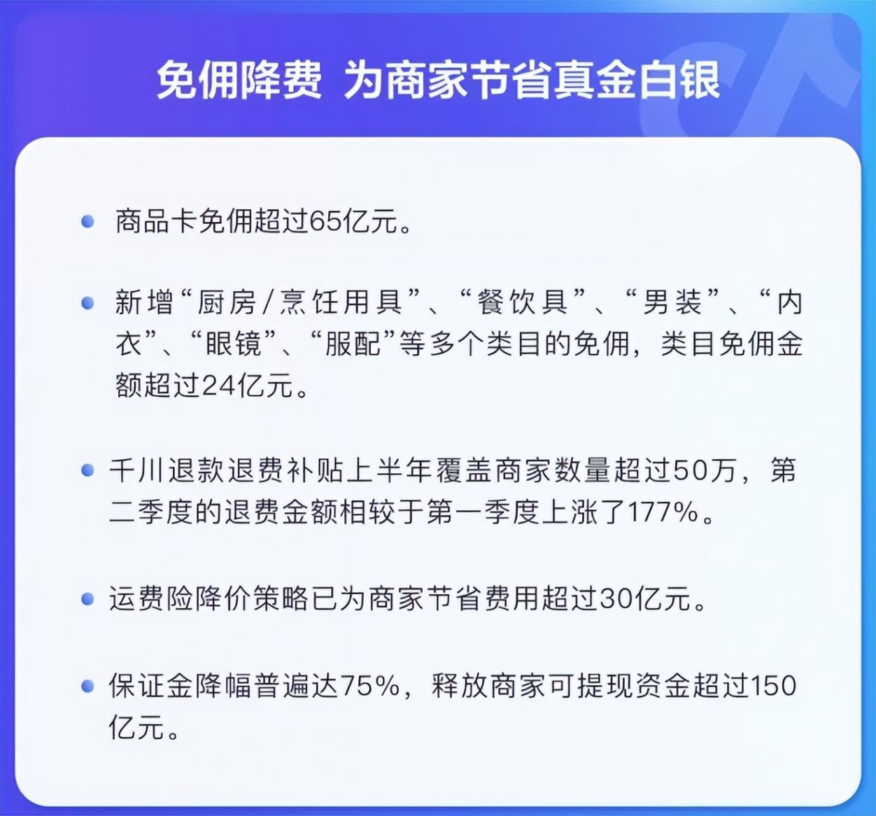 其中,仅“商品卡免佣”政策就为平台商家减免了超过65亿元的服务费,各行业的免佣政策为商家们节省成本超过24亿元,运费险降低5%-15%后,也为商家们节省费用超过30亿元。