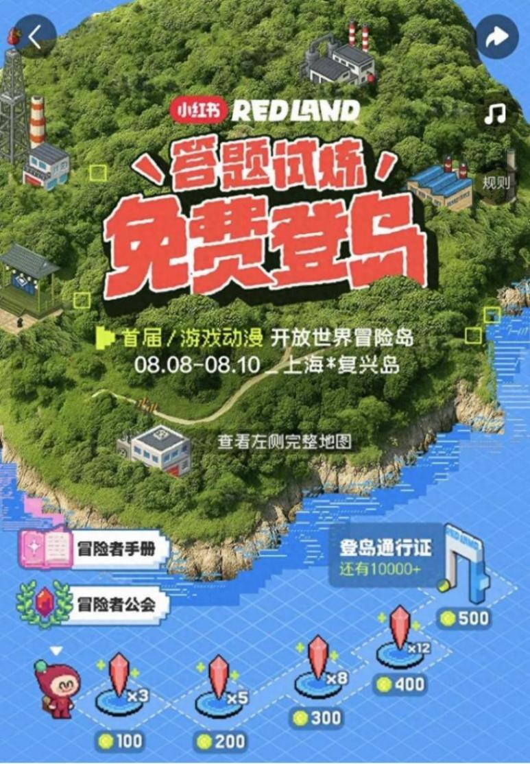 7月16日,小红书官宣,将打造开放世界冒险岛活动“RED LAND“,并于8月8日-8月10日落地上海。据悉,这也是小红书为游戏等爱好者们打造的超大型线下IP。