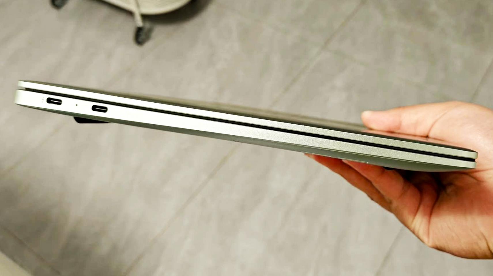 屏幕下方是realmebook增强版的键盘,它挤在超窄边框的布局中,相对尺寸较大。一是键盘的键符,去掉了小键盘,不分键位需要组合点按;二是键帽做了一定弧度处理,更贴合手指按压,操作较为舒适;三是键盘有背光,暗光环境下使用无压力。在键盘左右区域,机器的中框上,设计了拓展接口,数量有限,仅有两个全功能的c口,一个标准usb口,一个耳机孔,鼠标占据接口后,再添加设备得上拓展坞。