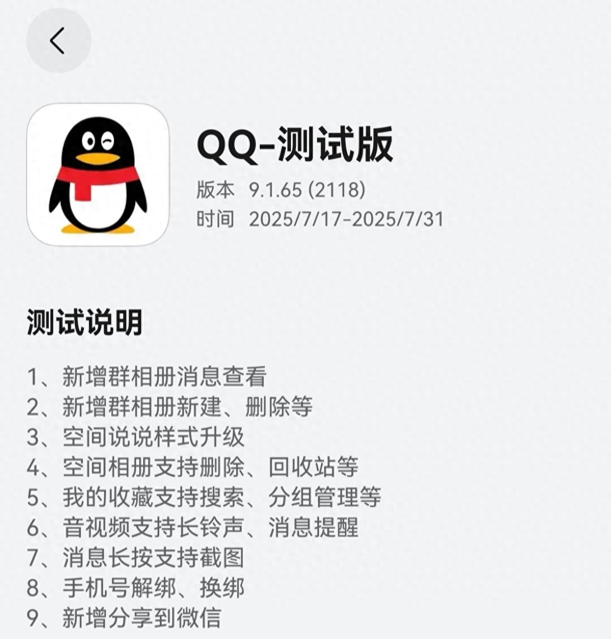 7 月 17 日消息,QQ 鸿蒙版 App 今日在华为应用市场(App Gallery)开启了 9.1.65(2118)版本邀测升级(需收到短信通知后点击链接跳转安装,未收到短信需继续等待),测试时间为 2025/7/17- 2025/7/31。