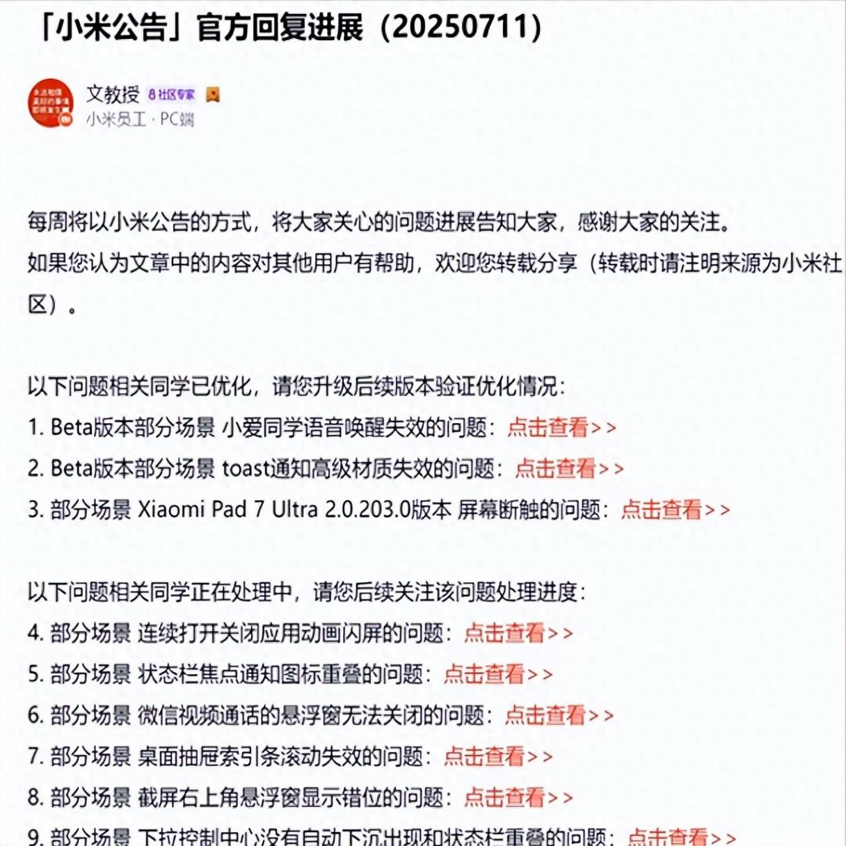 上周日刚发的通报,修了仨老毛病,但排队待修的问题还有七个等着呢。