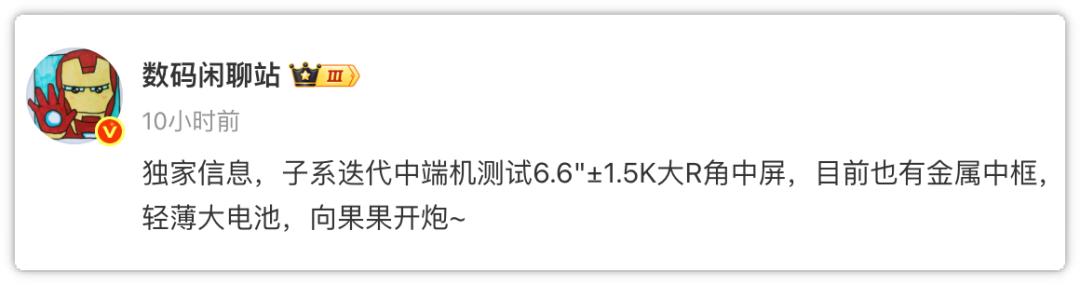 最近站哥也爆料了相关信息,其表示“子系迭代中端机测试6.6英寸左右1.5K大R角中屏,目前也有金属中框,轻薄大电池,向果果开炮!”