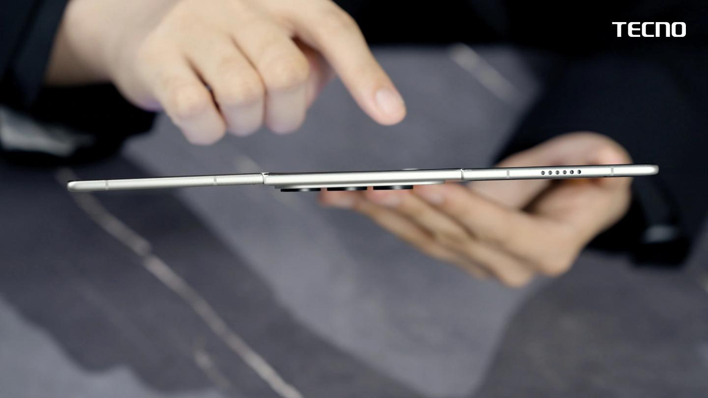 完全展开后,PHANTOM Ultimate G Fold Concept 呈现一块 9.94 英寸的大屏幕。TECNO 表示,这块屏幕的折痕控制得很轻微,能让手机从口袋中的便携设备变身为一台近 10 英寸的平板。