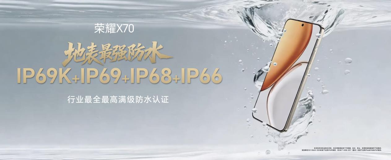 另外,荣耀 X70 在防水上实现突破性升级,成为主流厂商中首个达到 IP69K 工业级防水标准的机型,更具备 IP69K、IP69、IP68、IP66 行业最全最高满级防水认证,防水性能达到了专业户外三防机标准,在行业首次实现航海级密封防护。