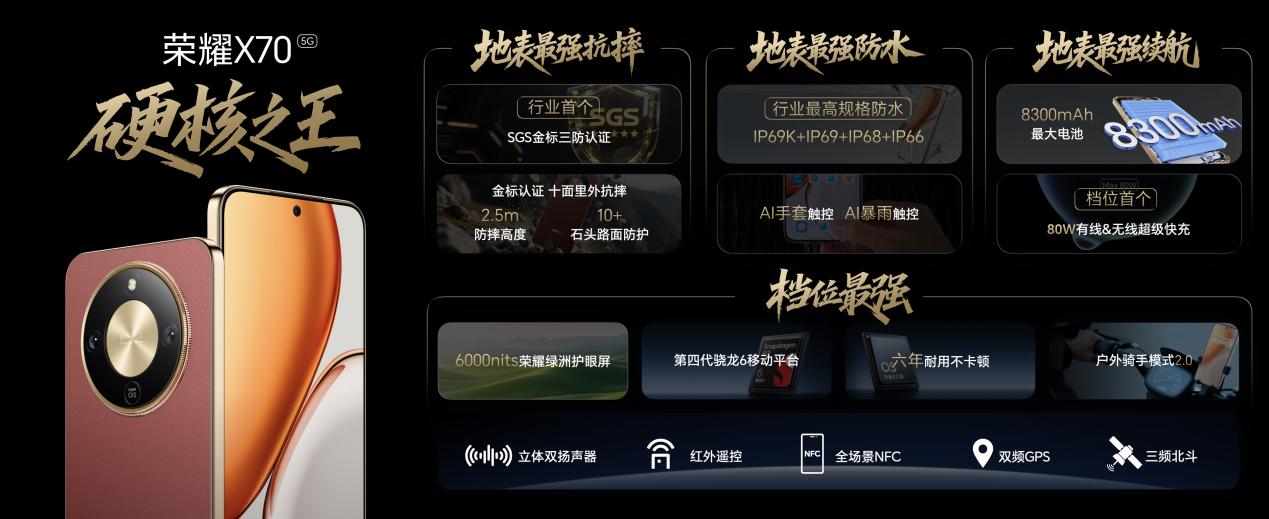 7 月 15 日,荣耀举办了荣耀 X70 新品发布会,全新“硬核之王”荣耀 X70 正式发布。这款手机以超硬核的耐用性和可靠性为核心卖点,凭借“行业最强抗摔、行业最强防水、行业最强续航”三大核心优势,打造了行业“耐用铁三角”。7 月 18 日 10:08,荣耀 X70 正式开售,国补到手价 1189.15 元起,可以说是现阶段同档位手机中最超值的产品,感兴趣的朋友可以放心入手。