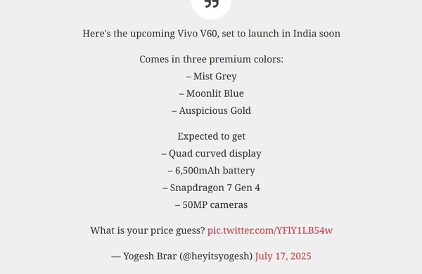 外媒猜测,vivo V60预计8月19日在印度上市(具体以官方公布为准)。