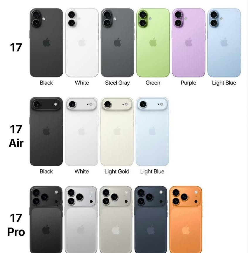最近网上曝出了iPhone17四款机型的颜色,说是苹果今年要来大招。新款手机叫iPhone17、17 Air、17 Pro和Pro Max,现在连颜色都给画出来了。据说九月初就要发新品,工厂已经开始批量生产了。