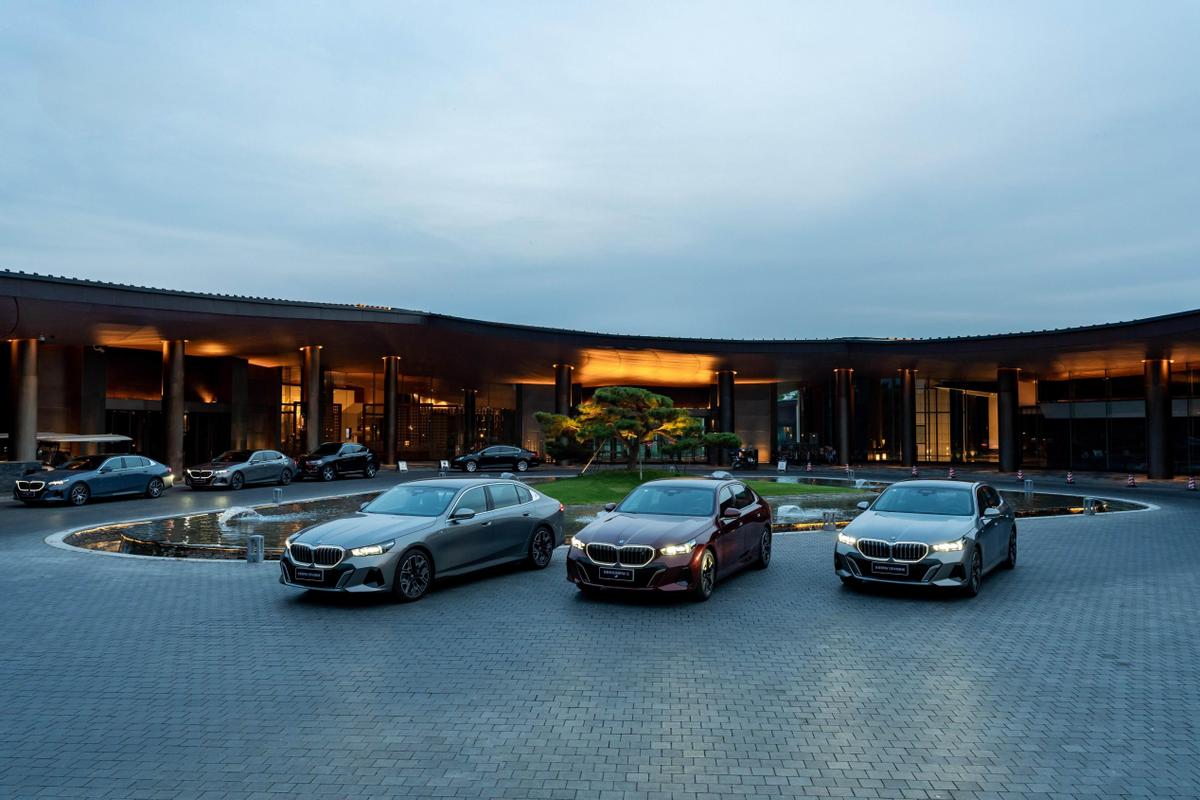 在停车休整时我也仔细欣赏了这一代宝马5系的设计,双肾格栅两侧有着相对较大的斜向设计,并且加入了一些暗金色的饰条装饰,L形日行灯取代天使眼设计后造型越发锐利。车侧面C柱配有单独的“5”字徽标,车顶也大胆增加了溜背化设计,配上内凹式的侧车门型面,让整车运动气质有所提升。车尾则依然采用左右分体式的尾灯结构,分层式的平直灯带点亮后灯效立体。